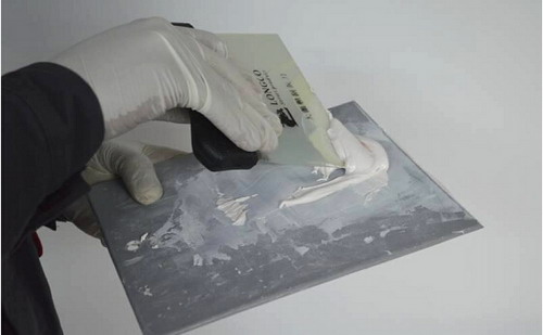 用原子灰刮刀取少量填眼灰置于原子灰托板上,也可以置于另一把刮刀片上。由于填眼灰一般不需要添加固化劑,取出后即可使用(有的填眼灰需按比例加入稀釋劑混合后才能使用),而且其固化時間很短,用量也少,所以應(yīng)少取,并且應(yīng)在盡量短的時間內(nèi)用完。