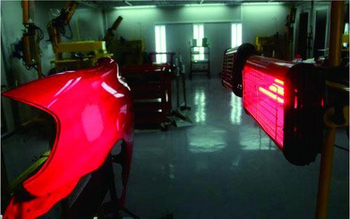 ②紅外線干燥。如果環(huán)境溫度太低或者空氣濕度太大,原子灰干燥固化速度就會減慢。為了縮短原子灰的干燥時間,可以借用干燥器或者是紅外線烤燈加熱原子灰進(jìn)行干燥。一般烘烤時間設(shè)定為10min左右,在烘烤過程中,要不斷檢測板件的溫度,并檢查原子灰是否已經(jīng)干燥。如圖2-51所示。