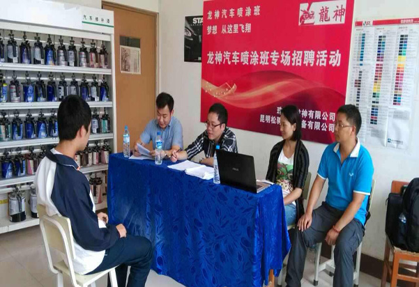 珠海龍神有限公司攜手昆明松騁汽修設(shè)備有限公司與昆明市官渡區(qū)職業(yè)高級(jí)中學(xué)建立更深層次的校企合作關(guān)系,開辦龍神噴涂班。現(xiàn)場(chǎng)選拔面試會(huì)已于2014年6月24日在昆明市官渡區(qū)職業(yè)高級(jí)中學(xué)隆重舉行!
